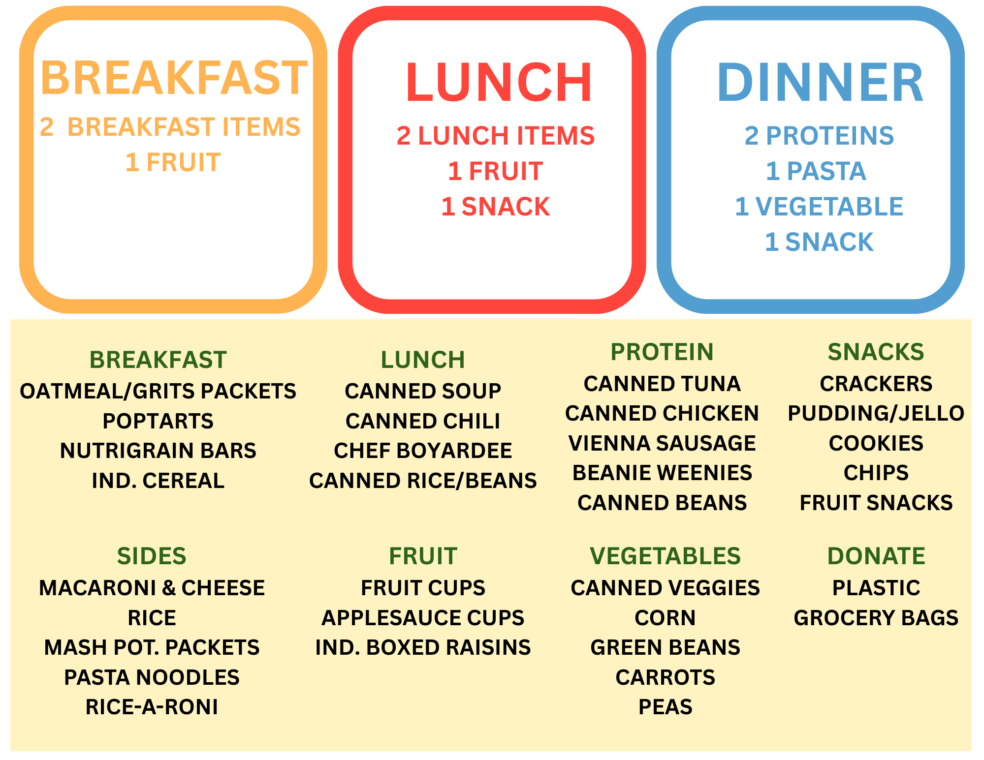 Non-perishable child-friendly foods and easy to prepare meals are always needed. (For Safety Reasons, please do not donate glass items)